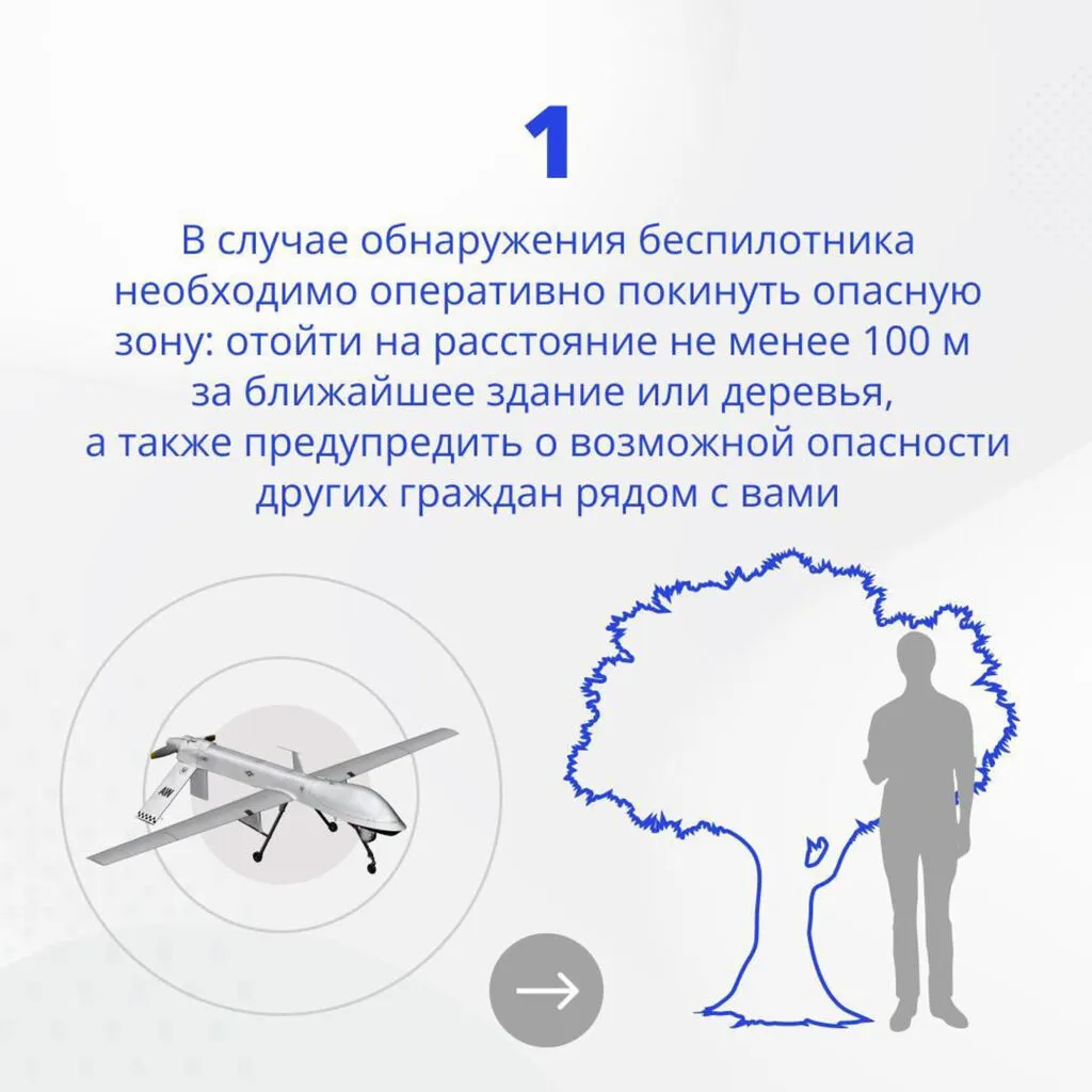 Если вы заметили беспилотник, то нужно немедленно отбежать на расстояние не менее 100 метров от места обнаружения. Необходимо укрыться за ближайшими зданиями или деревьями, а также предупредить других людей о возможной опасности.