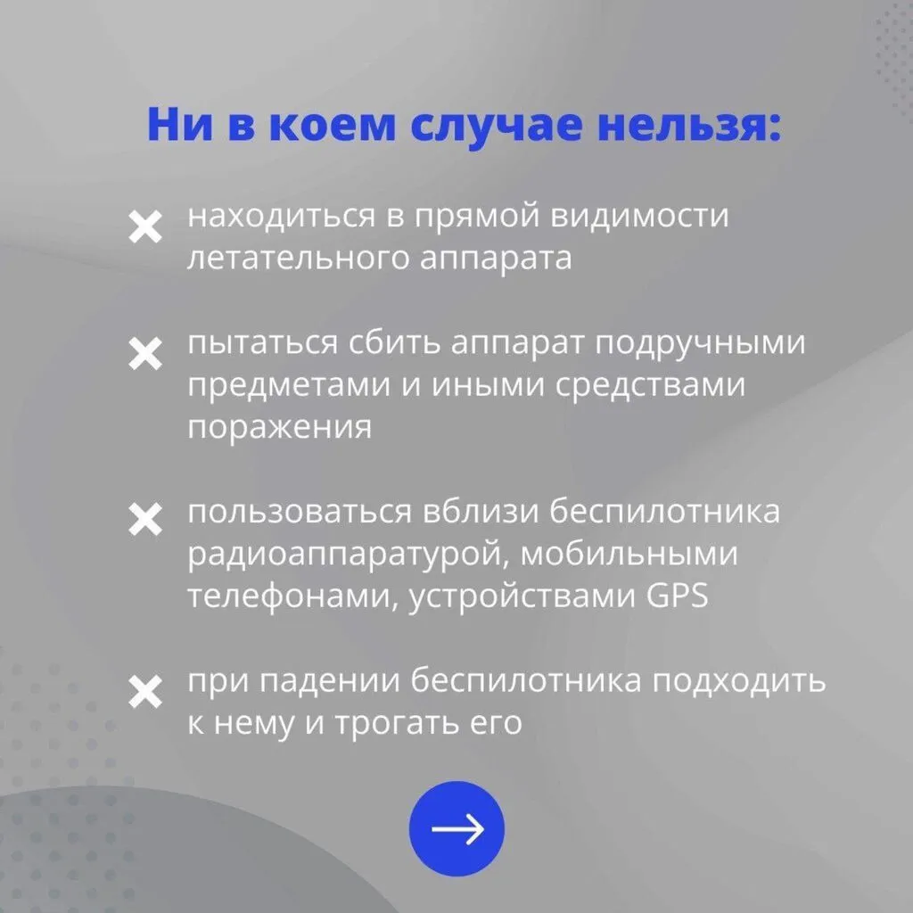 Ни в коем случае нельзя оставаться в прямой видимости беспилотника, пытаться его сбить, пользоваться рядом с ним телефонами, устройствами GPS и радиоаппаратурой. Если беспилотник упал, то к нему нельзя подходить и трогать.