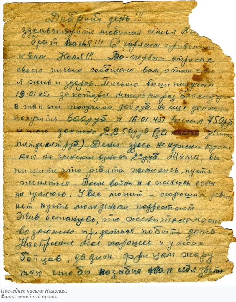 Почти все письма домой Николай начинает одинаково: «Добрый день! Здравствуйте, любимые мама и Ваня! С горячим приветом сын Коля!» Вслед за этими словами идут подробности, которые мы и публикуем, сохраняя лексику автора.