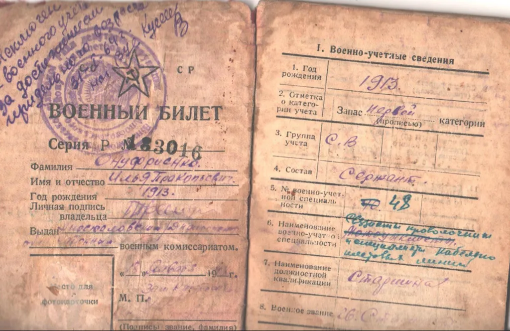 Илья Прокофьевич был призван 15 мая 1935 года в двенадцатый Кавказкий мотополк, где служил до 1941 года С 1941 по 1945 годы старшина роты связи , командир взвода. Присягу принял 20.08.1942 года. В партии с 1943 года. До призыва был пасечником. В рядах Советской армии находился 10 лет . Илья Рокофьевич был председателем колхоза 9 лет, целых 15 лет депутатом сельсовета. Его знали как честного и справедливого человека. В последние годы был бригадиром. Уже в мирное время его настигла страшная болезнь – рак, от которой он и скончался…
